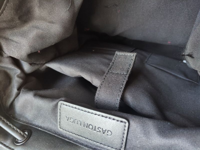 先看看包包正面,比较简洁,在靠近下方区域内嵌了一块皮革,上面是篆刻了这个 CASTONLUGA 的品牌以及它比较简洁的 LOGO,符合我比较喜欢的简洁风格,毕竟上了年纪,太花里胡哨的不是太适合。