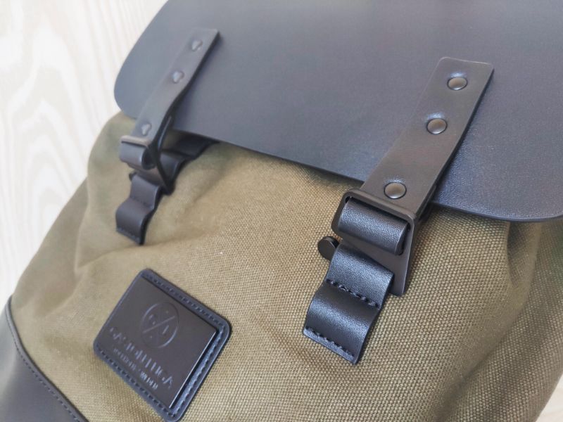 这款背包的包盖采用的是皮质翻盖的设计,一大块皮革直接盖住了包口,同时遮到了包的前半部分,这也是这几年的潮流设计,感觉好像很有”B 格“的样子,但是我倒是不喜欢这么大面积的皮质运用,个人喜好吧。