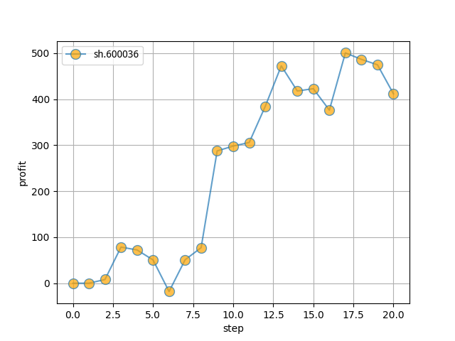 以 1990 年年初到去年 11 月底的股票数据作为训练集,去年 12 月股票数据作为测试集。作者先用单只股票试验了一下,初始本金为 10000 元人民币(股票代码 sh.600036,招商银行),进行了为期 20 天的模拟操作,经历了一番起伏,最终盈利 400 元。