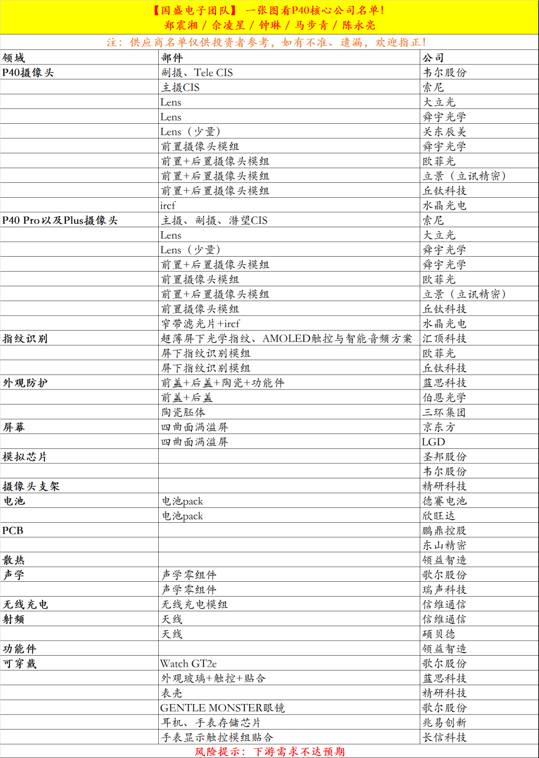 上周,华为正式发布了新款华为P40系列手机,近日国盛电子就曝光了一份P40系列手机的核心供应商名单。
