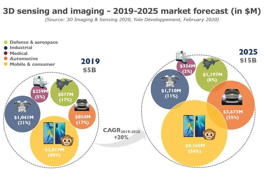 的最新调查显示,全球3D成像与传感市场将以20%的年均复合成长率(CAGR)从2019年的50亿美元成长至2025年达到150亿美元。