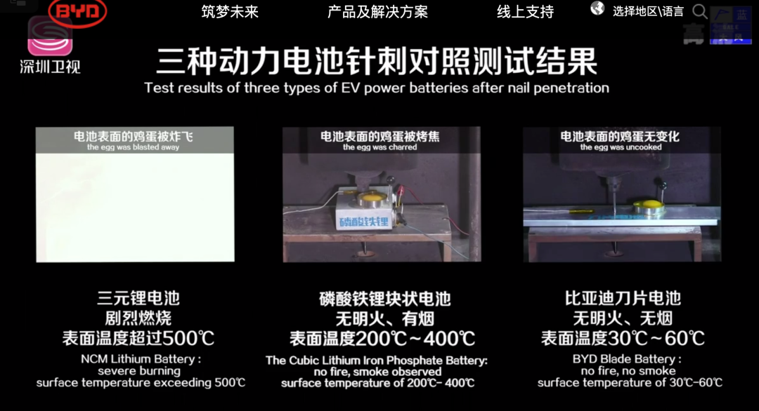 刀片电池外观图,来自官方提供刀片电池依然采用了比亚迪擅长的磷酸铁锂电池,将传统电池单体大幅拉长,长度可以做到2米,厚度为13.5毫米。同时,在刀片电池的侧脊面上安装高强度板,让刀片电池侧面可以承担支撑作用。这一系列设计可以让刀片电池跳过模组环节,直接组成电池包,从而提升空间利用率。“刀片电池既是能量体,又是结构件,可以成为直接支撑电池包的梁。”何龙说,相较传统电池包,刀片电池的体积利用率提升了50%以上,也就是说续航里程可提升50%以上,达到了高能量密度三元锂电池的同等水平。不过,即便是在磷酸铁锂这条比亚迪已十分熟稔的技术路线上,宁德时代依然抢先一步,在去年9月的法拉克福车展上发布了CTP(Cell to pack)技术,这一技术与比亚迪刀片电池的思路相似,都是跳过模组,由电池单体直接成组电池包,据路透消息,宁德时代的磷酸铁锂CTP方案将在7月向特斯拉供应。电池装机量长期被宁德时代领先,新能源车全球销量第一的位置也在去年被特斯拉超越,比亚迪急需一个发起强力反击的筹码,而刀片电池显然承载了这个使命。