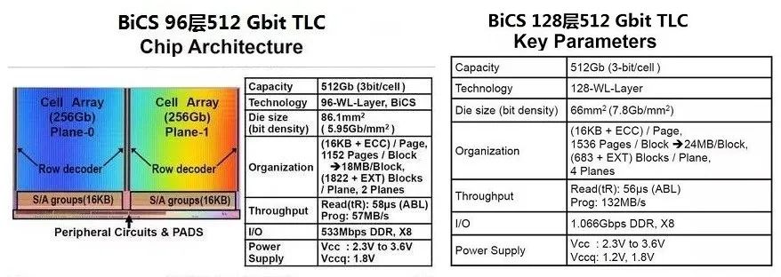 SK海力士最早在2019年6月公开发布128层4D TLC NAND,相较于96层的生产效率提高40%。之后不到半年的时间,SK海力士在2019年11月份向主要客户交付基于128层1Tb 4D NAND的工程样品,包括1TB UFS 3.1、2TB 客户端cSSD、16TB 企业级eSSD,2020下半年都将大规模量产出货。