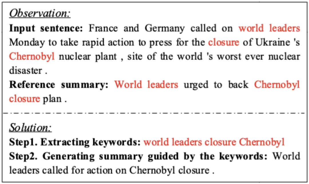 我们举一个简单的句子摘要的例子。如图 1 所示,我们可以大致将输入句子和参考摘要的重叠的词(停用词除外)作为关键词,这些重叠的词语覆盖了输入句子的要点。例如,我们通过关键词“世界各国领导人”“关闭”和“切尔诺贝利” ,可以获取输入句子的主旨信息,即“世界各国领导人呼吁关闭切尔诺贝利”,这与实际的参考摘要 “世界各国领导人敦促支持切尔诺贝利核电站关闭计划。”是相吻合的。这种现象在句子摘要任务中很常见:在 Gigaword 句子摘要数据集上,参考摘要中的词语超过半数会出现在输入句子中。