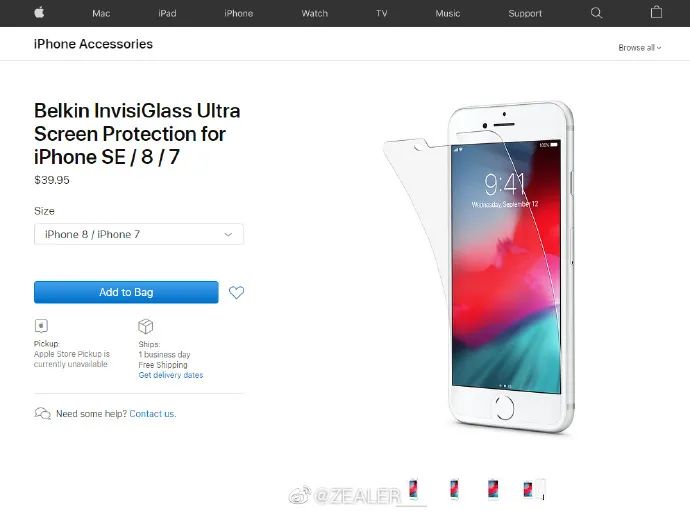 在苹果官网配件中,发现了一款 iPhone SE / 8 / 7 通用贴膜。大家应该都知道,早前的 iPhone SE 为 4.0 英寸屏幕,是无法与 4.7 英寸 iPhone 8 共用同款贴膜的,那这只可能是 4 月 iPhone 新机的名称了。