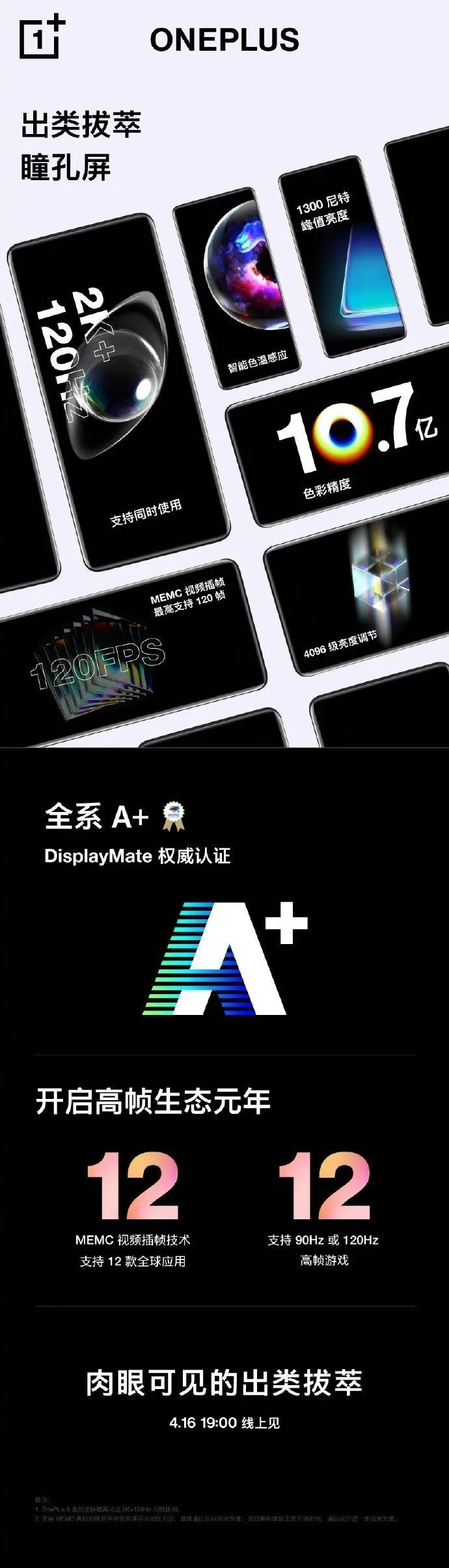 一加手机官方公布了一加 8 系列屏幕的最新消息,一加 8 系列色彩精度 10.7 亿,MEMC 最高支持 120 帧,再加上之前公布的 2K 和 120Hz 。