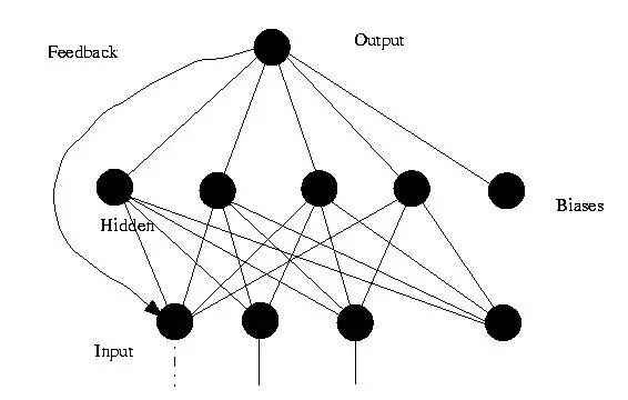 对于一个3层的前馈神经网络 N ,若用 X 表示网络的输入向量,W1 ~ W3表示网络各层的连接权向量,F1 ~ F3 表示神经网络3层的激活函数。O3 = F3( F2 ( F1( XW1 ) W2 ) W3 )若激活函数 F1 ~F3 都选用线性函数,那么神经网络的输出 O3 将是输入 X 的线性函数。因此,若要做高次函数的逼近就应该选用适当的非线性函数作为激活函数。(2) 反馈神经网络 ( Feedback Neural Networks )反馈型神经网络是一种从输出到输入具有反馈连接的神经网络,其结构比前馈网络要复杂得多。典型的反馈型神经网络有:Elman网络和Hopfield网络。图:反馈神经网络