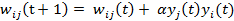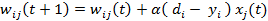 受该实验的启发,Hebb的理论认为在同一时间被激发的神经元间的联系会被强化。比如,铃声响时一个神经元被激发,在同一时间食物的出现会激发附近的另一个神经元,那么这两个神经元间的联系就会强化,从而记住这两个事物之间存在着联系。相反,如果两个神经元总是不能同步激发,那么它们间的联系将会越来越弱。其中 wij 表示神经元 j 到神经元 i 的连接权,yi 与 yj 为两个神经元的输出,a 是表示学习速度的常数。若 yi 与 yj 同时被激活,即 yi 与 yj 同时为正,那么 wij 将增大。若 yi 被激活,而 yj 处于抑制状态,即 yi 为正 yj 为负,那么 wij 将变小。Delta学习规则是一种简单的有监督学习算法,该算法根据神经元的实际输出与期望输出差别来调整连接权,其数学表示如下:其中 wij 表示神经元 j 到神经元 i 的连接权,di 是神经元i的期望输出,yi 是神经元 i 的实际输出,xj 表示神经元 j 状态,若神经元j处于激活态则 xj 为 1,若处于抑制状态则 xj 为 0 或-1(根据激活函数而定)。a 是表示学习速度的常数。假设 xi 为1,若 di 比 yi 大,那么 Wij 将增大,若 di 比 yi 小,那么 Wij 将变小。Delta规则简单讲来就是:若神经元实际输出比期望输出大,则减小所有输入为正的连接的权重,增大所有输入为负的连接的权重。反之,若神经元实际输出比期望输出小,则增大所有输入为正的连接的权重,减小所有输入为负的连接的权重。这个增大或减小的幅度就根据上面的式子来计算。采用BP学习算法的前馈型神经网络通常被称为BP网络。