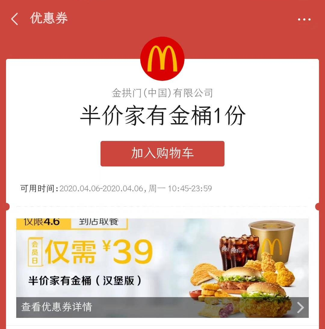 就在4月5号,麦当劳默不作声地推出了半价桶活动,原价89元的麦当劳金桶,在6号当天,半价出售。