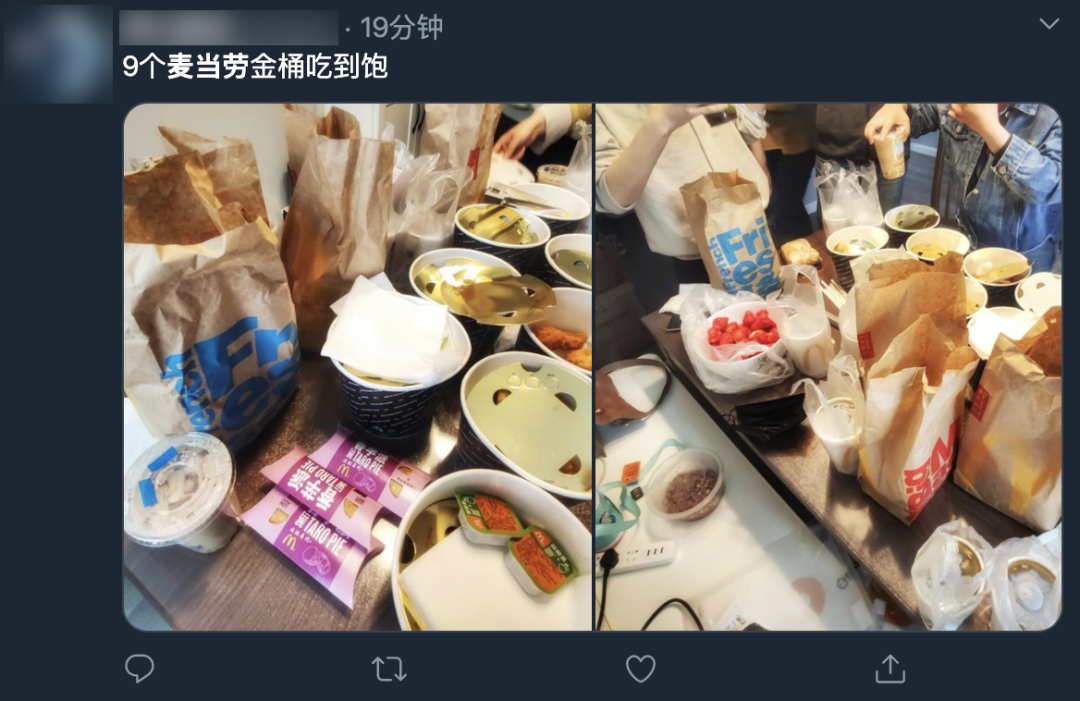 年轻人在4月6日分道扬镳,只分成两种,一种是吃到麦当劳半价家有金桶的幸运儿,一种是没吃到的。