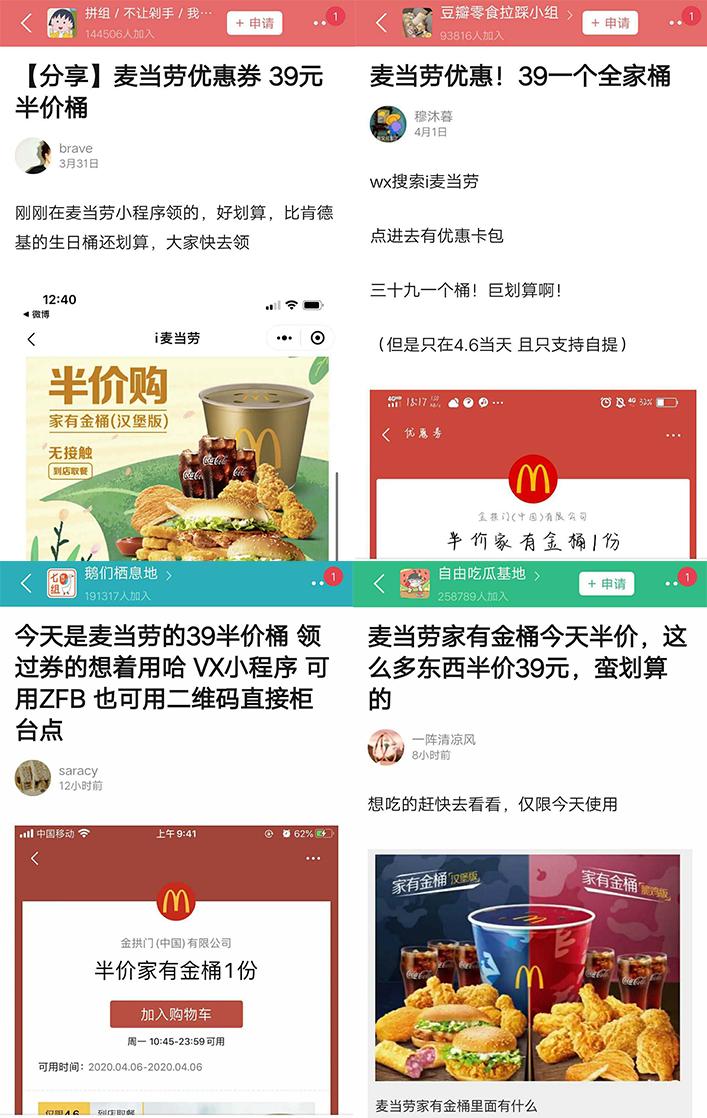 豆瓣反应最为迅速,不同小组将宣传口径一一对准了麦当劳,优惠信息广泛传播。