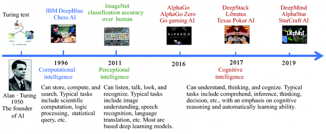 从1936年人工智能之父阿兰⋅图灵提出著名的“图灵测试”之后,人和机器之间进行智能对抗就成为了衡量机器智能发展水平的最重要标准。从实现最初的简单智能到不断进化成更为复杂的智能,对抗贯穿于人工智能中计算、感知和认知的3个阶段(图1),从某种意义上讲,就如人类与自然环境的对抗促进了人类的进化,机器与人的对抗也必将让机器智能不断发展进化。