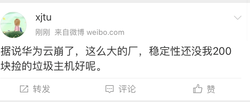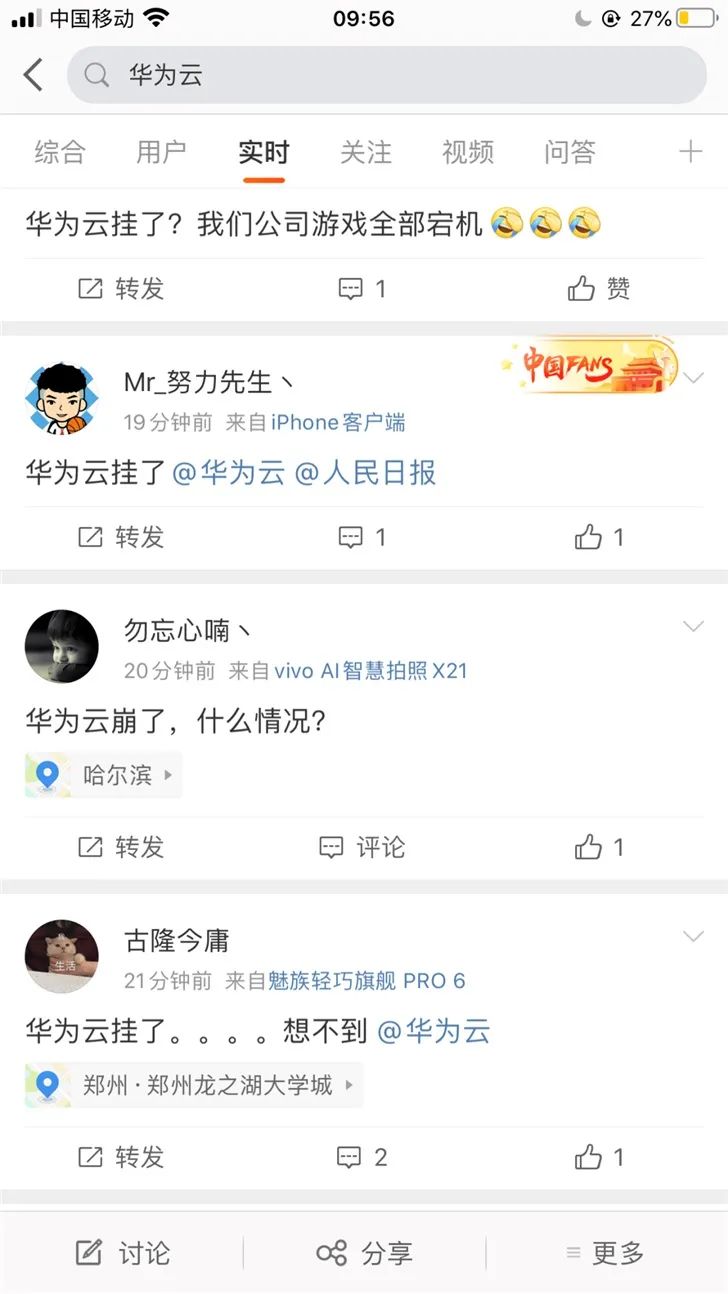 第一批发现华为云故障情况的网友先是懵逼了一阵,然后就开始疯狂吐槽自家业务受到了多么大的影响。