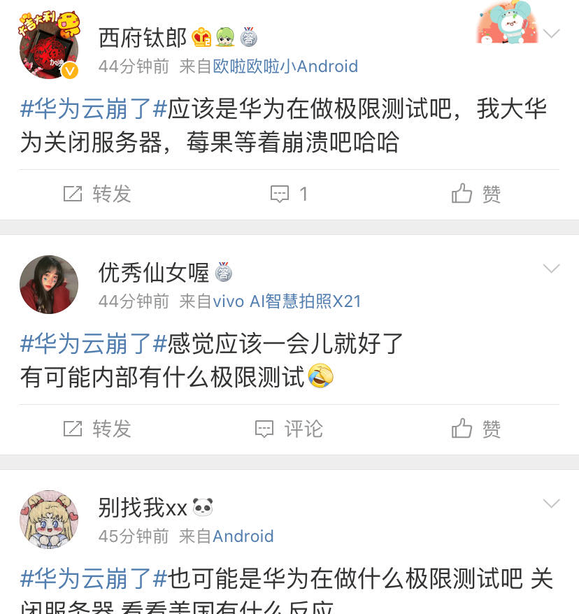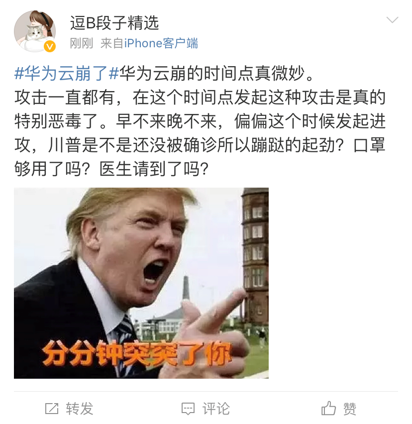 另有一部分网友则默默搞起了阴谋论,表示“华为是真的民族脊梁了,网上冲浪这么多年,大部分都是友商菜鸡互啄,只有华为这么多年屹立不倒,不是阴谋我都不信”、“华为云崩的时间点真微妙,攻击一直都有,在这个时间点发起攻击是真的特别恶毒了。早不来玩不来,偏偏这个时候发起进攻”、“华为紧急关闭服务器这是在极限测试吗?看看美国是不是会因此崩溃”......