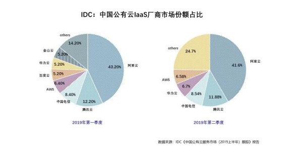 华为云一直在其中位居前五,在2019年第一季度和2019年第二季度的市场份额占比分别为5.2%和6.7%。