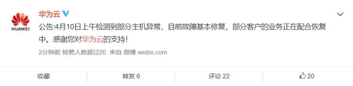 对此,华为云官微回应称,4月10日上午检测到部分主机异常,目前故障基本修复,部分客户的业务正在配合恢复中。