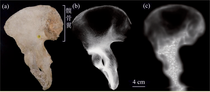左:人的右髋骨的实物照片;中:X射线成像图;右:太赫兹成像图;髋骨翼含有更多的海绵组织,髋骨的下方含有更多的密质骨。通过X射线成像只能看出髋骨翼对X射线透过性很高,而太赫兹成像技术能够很好地通过色度的变化展现出髋骨的构成变换情况。