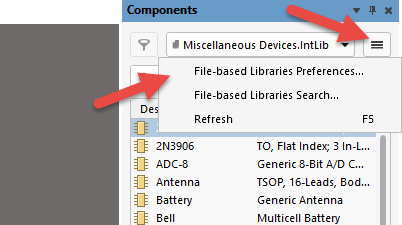 (1)在指定库路径前,要移除PCB中已关联的系统库。打开PCB设计交互界面,在右下角执行命令“Panels-Components”,进入“Components”面板,执行如下图所示的图标命令,选择“File-based Libraries Preferences...”,进入集成库安装界面。
