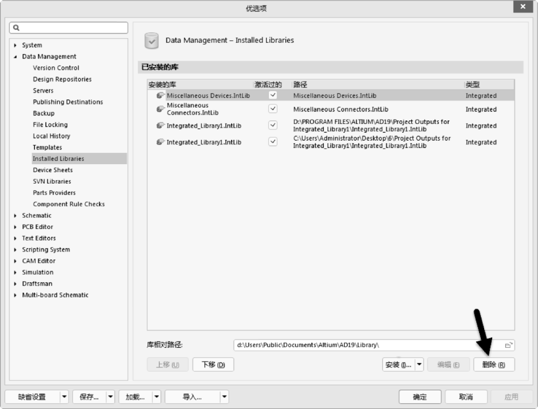 (2)在如下图所示的集成库安装界面中,选择“安装的库”下的所有库,再单击“删除”按钮,完成已关联系统库的移除操作。
