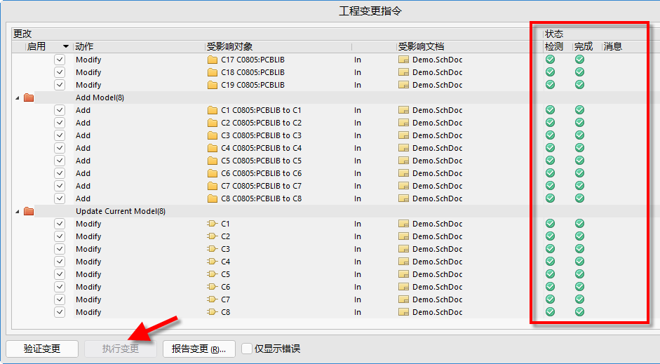 (4)对封装进行完编辑或添加等操作之后,按右下角的“接受变化(创建ECO)”按钮,在所得到的对话框中,对更新内容单击“执行变更”按钮,更新到原理图当中,如下图所示。
