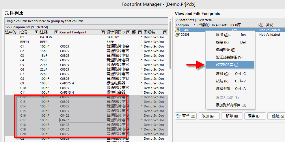 (3)在封装管理器中,可以对一个或多个元件进行封装的添加、删除、编辑等操作,同时可以通过注释值筛选,局部或全局更改(或添加)同类型元件封装名,如下图所示。