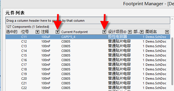 (2)在如下图所示的封装管理器中,原理图中涉及的元件都在“元件列表”里面进行了显示,单击“Current Footprint”,可对同类型的封装进行集中排序,方便设计者按照封装类型去检查封装的完整性,若某个元件没有添加封装,会优先在前排显示处理。