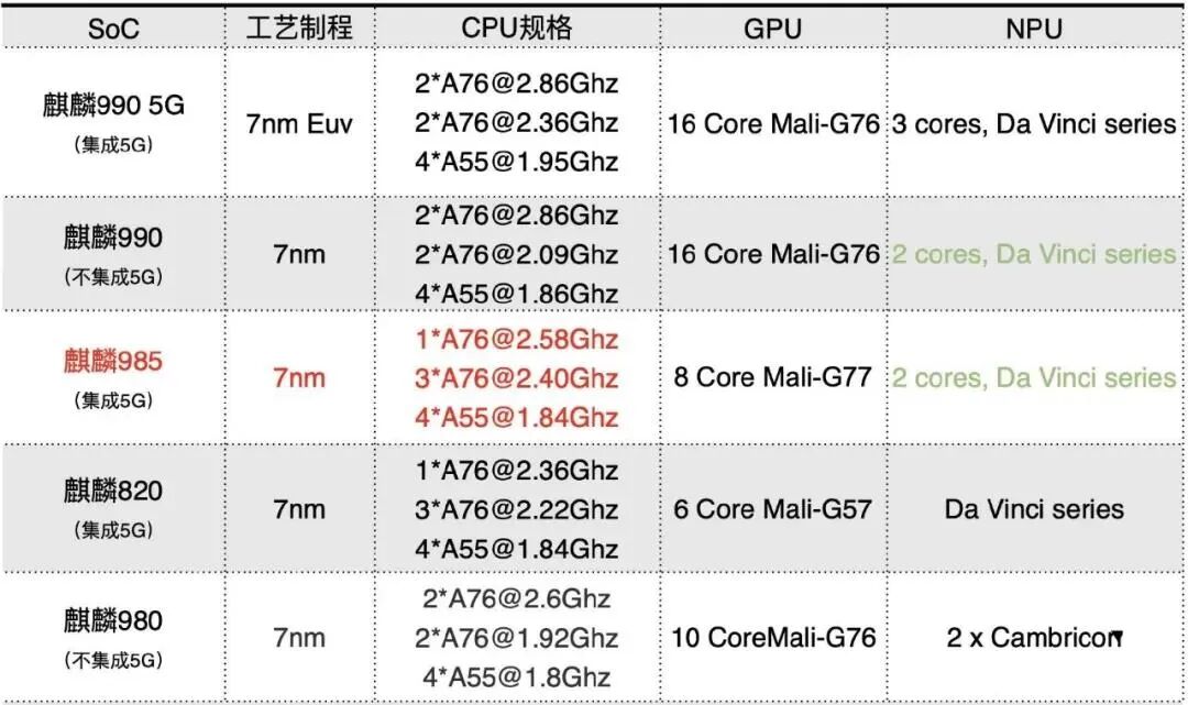 麒麟985不止在发布时间上给人错配的感觉,硬件配置上更是让人看不懂。旗舰产品的配置应高于次旗舰产品,这是常识,但麒麟985的配置却高于麒麟990。