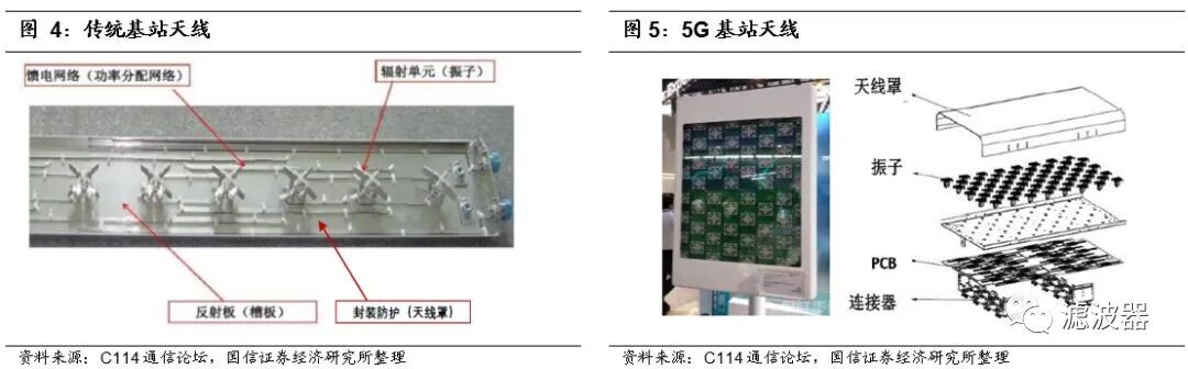 3)传统基站天线主要由辐射单元(振子)、反射板(底板)、功率分配网络(馈电网络)、封装防护(天线罩)、电调天线控制器RCU组成。5G天线,振子、功放、滤波器都集成到PCB上。