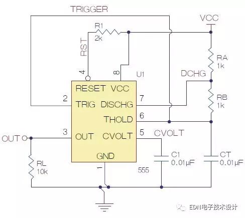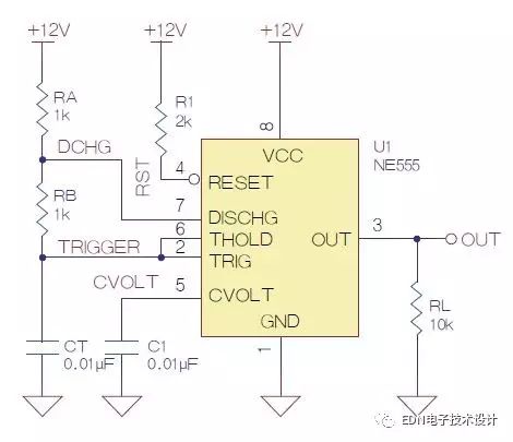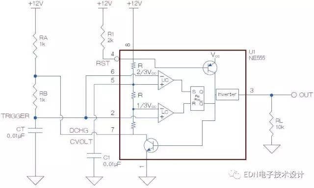 我的做法是使用输入在左侧的规则重画元件符号(图8)。我还使用了独立的电源与地符号,以便减少杂乱现象,毕竟我们关心的是信号流向。大多数工程师理解555定时芯片内部的功能。但如果你不知道,或者你认为阅读该原理图的人不知道,那么你可以在元件内部画上一些或所有框图。Altium/CircuitStudio允许你在原理图符号上放置图片,因此我在网上找到一个很好的555定时器框图,经过一些细微调整后我将它放进原理图符号中。我不得不遵循它们的引脚输出结构,因此原理图上有些跳接(图9)。图8:修改图7中的555定时器,将输入放在左边,输出放在右边,这样原理图流向更清晰。单独的电源与地符号消除了走线的杂乱现象。