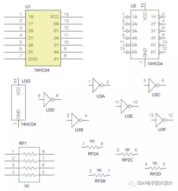 图1中的六反相器U1不是很实用。它将6个反相器合成在一个符号中,并且左边和右边都有输入输出。引脚长度也不需要那么长。U2这个符号稍微好一些,输入都在左边,输出都在右边。像我这样一把年纪的人不喜欢彩色背景,因为经过六次黑白拷贝黄色会变成黑色,从而让你无法看清任何东西。我创建的U3由不同元件组成(异构元件),包括6个相同的元件和表示电源与地的第7个元件。排阻RP1是非常愚蠢的画法,当这些电阻应该处于原理图上不同位置时很容易把原理图弄得一团糟。RP2显示了异构元件在这种时候的作用。
