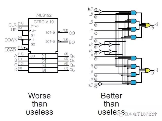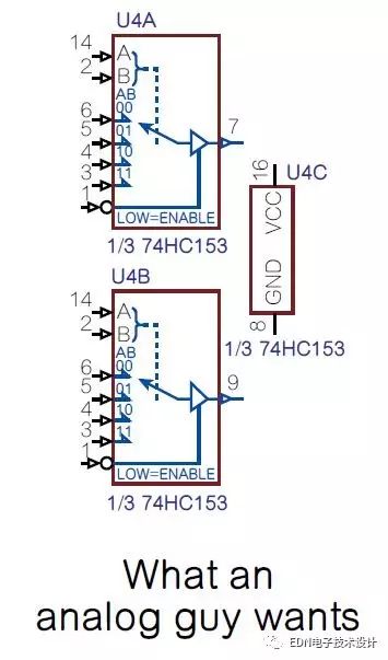 一些半导体公司采用ANSI符号画逻辑器件,这显然是由缺乏分析的线性思维的人发明的,而不是模拟工程师眼中的图形化思维(图2)。图2:许多工程师都不喜欢ANSI/IEEE逻辑符号画法,这些符号简直是非徒无益,而又害之。显示实际的逻辑符号稍好一些。CAD软件包中附带的元件基本上是没有用的。较好的做法是将元件一分为二。更好的做法是将电源独立出来,这样就不会弄乱信号流向。模拟工程师最想要的是在元件内部稍微画一些能表示其功能的图案。