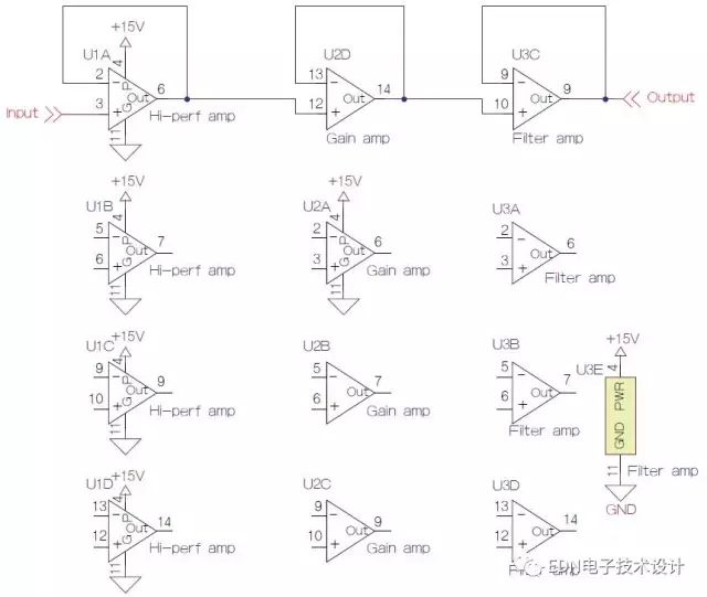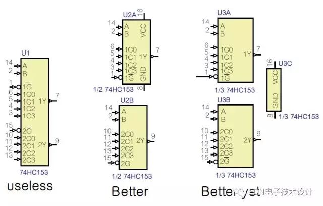 在现代设计中,电源和地引脚不可见带来的问题是,当版图封装的电源连接错误时电路经常会烧掉。经常会烧。这是一个很严重的问题,因为你可能有多个带电源的层,而重新做PCB甚至重新搭建原型是很困难的。基于这个理由,我们许多人会把电源引脚明确地画出来。对于像四运放这样的多元件封装来说有三种方法来实现(图5)。第一种方法是你可以将电源引脚画在每个元件上。第二种方法是只将电源引脚画在其中一个元件上,这时要确保将所有未用元件也都放到原理图上。第三种方法是将四运放设计成由5个元件组成的异构封装,包括4个独立的运放和一个单独的电源与地引脚元件。这种方法的优点是你可以将电源与地元件和所有去耦电容放在一起。缺点是你可能忘了放电源与地元件,由此带来的灾难是器件没有供电而不是接错电源。一个技巧是将电源引脚作为封装中的第一个元件,这样当你放置这个元件时第一个放的就是电源。不管怎样,你都应该将所有元件都放到原理图中去,以便给未用元件合适的偏置,防止它们发生振荡。图5:电源和地不要使用零长度的引脚。相反,最好在U1的每个元件上画出电源引脚。你也可以只在封装的某个元件上画电源引脚,但要确保所有元件都被放置,这样你就不会忘了连接电源(U2)。U3封装则是使用了一个单独的“元件”来画电源和地。这样做的优点是你可以翻转运放,根据电路需要灵活地将负引脚放在正引脚的上面或下面。