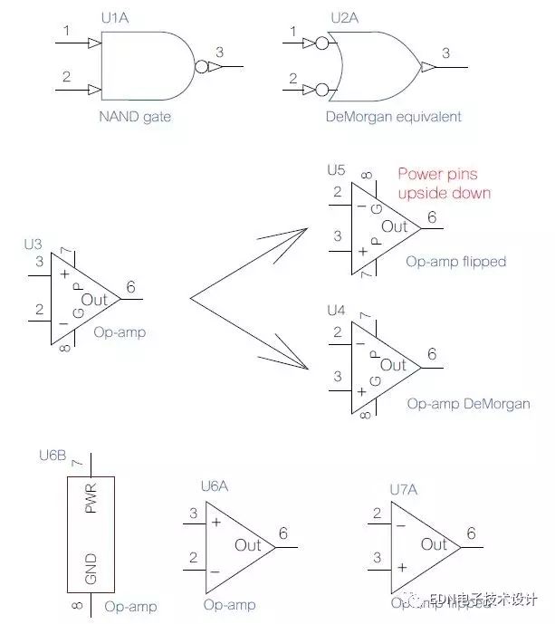 对于多元件封装来说(比如许多逻辑门),原理图符号需要分解开来,因为你很少会在原理图的同一个地方使用全部这些元件。这个原则同样适用于双路或四路运放。元件符号可以采用德·摩根等效符号(图3)。我非常敬佩那些能够通过布尔表达式来理解电路工作的工程师,但我还是喜欢图形化的表达方式——通过图形可以想象位于D锁存器中的比特,或者多路复用器中断言给定输入的引脚。图3:早在1995年,OrCAD 9就允许用德·摩根等效符号表示与非(NAND)门。Altium/CircuitStudio可以让用户给元件分配不同的“模式”完成相同的任务。如果你想画一个“引脚上负下正”模式的运放符号就非常方便。若是没有等效符号,如果你想垂直翻转一个元件,也会把正电源放到下边,把地放到上边去。通过调用绘制的德·摩根等效符号,你可以交换输入引脚,同时保持电源和地的位置不变。解决这个问题的另外一种方法是制作一个具有独立电源的异构元件(U6)。现在你可以垂直翻转运放,将负引脚放到上面来。