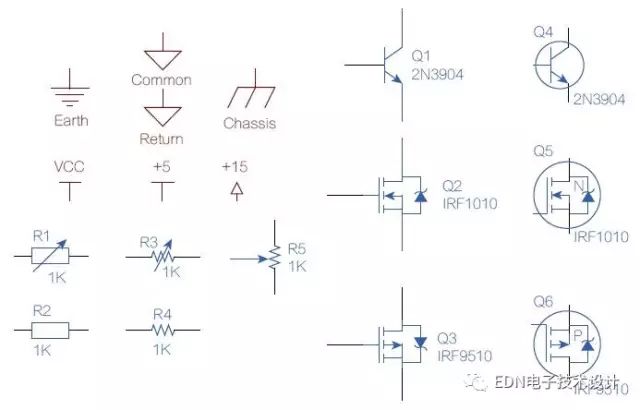说到地,“公共端”或“回流端”其实更贴切,除非你的电路连接到墙上插座的大地引脚(图4)。我承认这只是个人喜好,但我喜欢美国风格的电源和电阻符号,在晶体管和MOSFET上有个圆圈,且MOSFET清楚地指示了N沟道或P沟道类型。图4:地、电源、电阻、晶体管和MOSFET等各种元件符号。