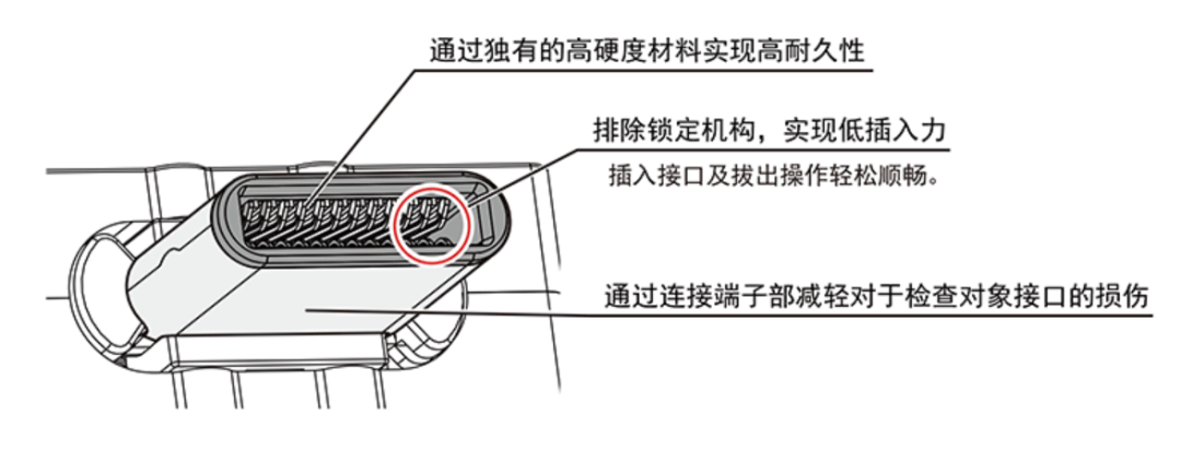 插头前端结构由树脂构成,有弹性可浮动,灵活性高可以避免损伤检测对象接口。
