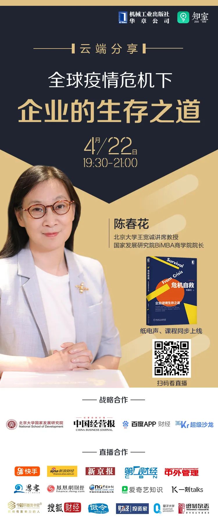 由机械工业出版社主办,36氪超级沙龙战略合作——今晚19:30,北京大学王宽诚讲席教授、国家发展研究院BiMBA商学院院长陈春花老师直播分享《全球疫情危机下,企业的生存之道》。