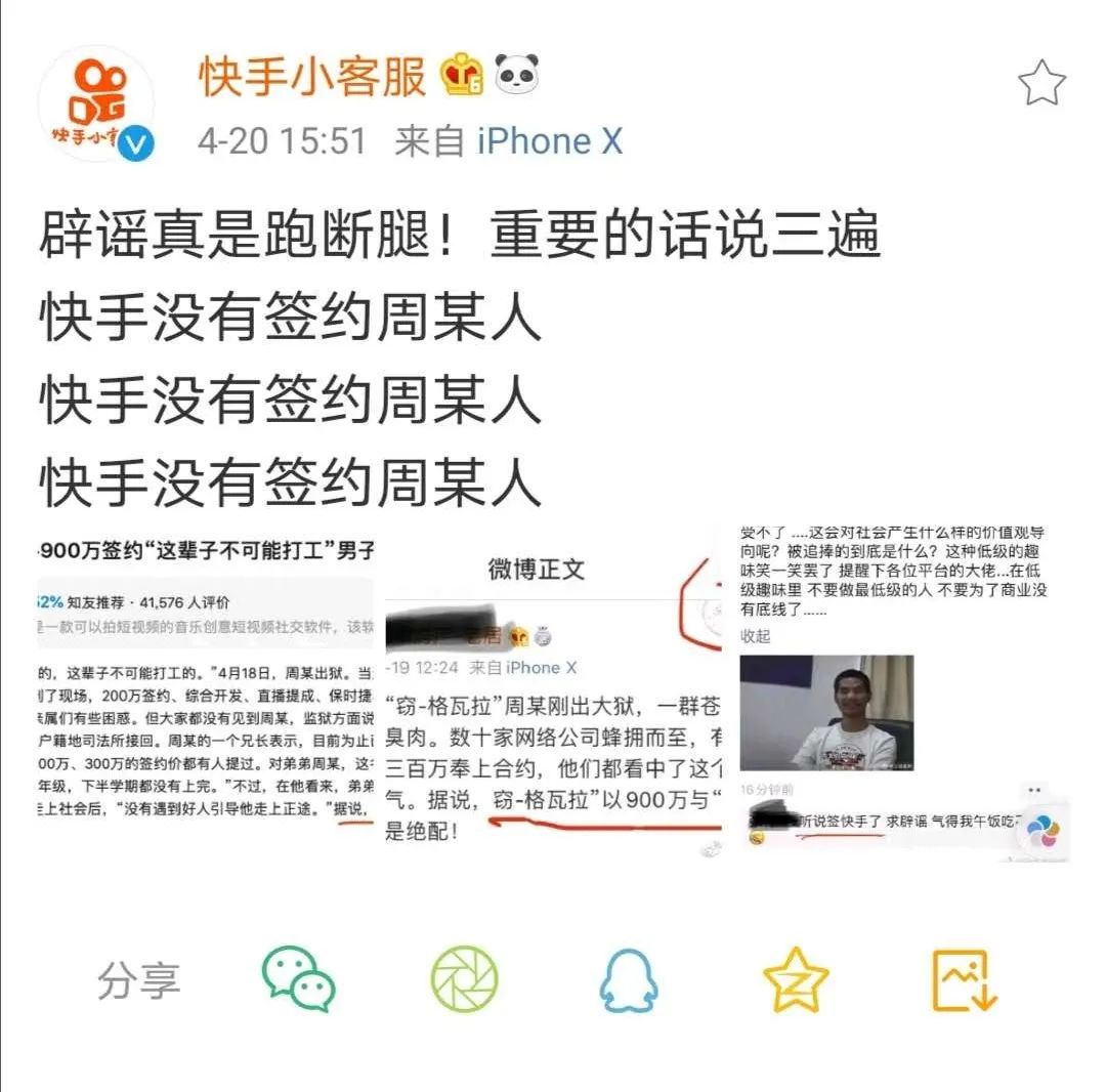 快手回应900万签约“这辈子不可能打工”男子:快手没有签约周某人