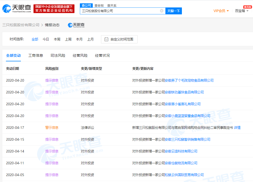 三只松鼠1天成立4家公司,经营范围涉及宠物销售、婚庆服务等