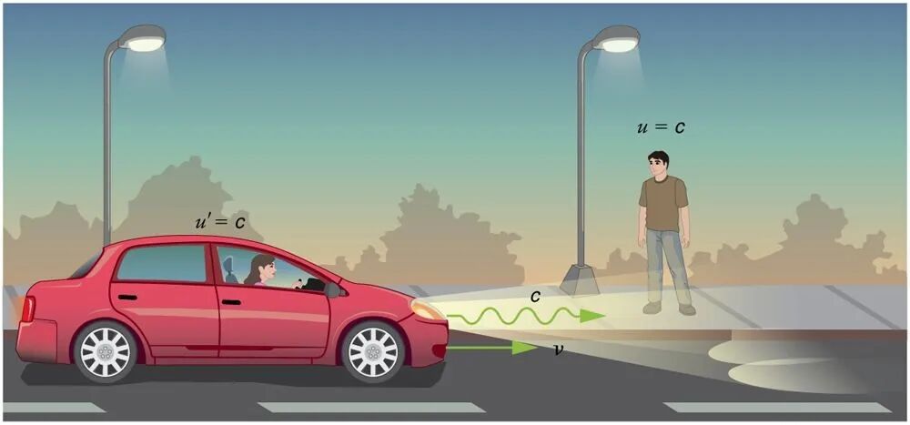 它直接颠覆了我们熟知的速度合成法则。我在地面观测火车上物体的运动速度,那肯定是要把火车的速度和物体的运动速度叠加起来考虑的,怎么可能我在火车上观察这个物体是这个速度,在地面上观察还是这个速度呢?