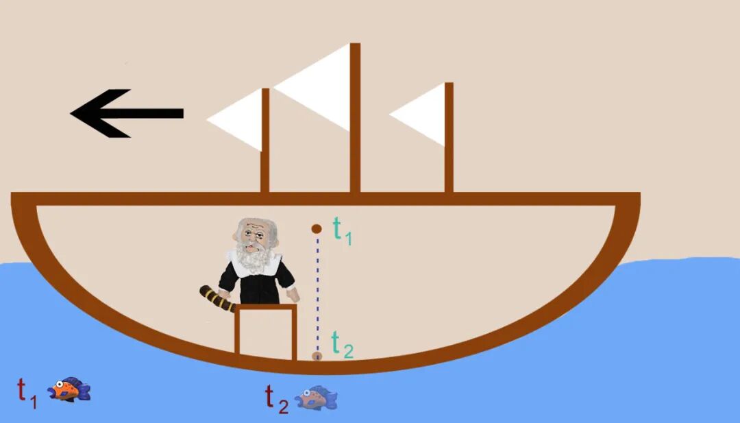 也就是说,我们根本无法通过力学实验区分这艘船是静止的还是匀速直线运动的,这就是伽利略的相对性原理。
