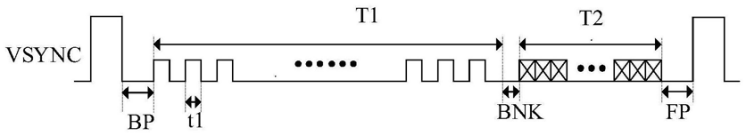 在图1中的步骤102,TDDI芯片被调整为重负载模式,TDDI芯片控制显示面板中每行像素依次进行显示,同时将显示面板中每行像素的显示时长调整为第一显示时长t1,并为每一帧图像分配显示时长T1,触控时长T2,如图2所示。