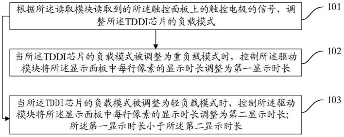 此专利中的触控显示装置包括触控显示面板以及与触控显示面板连接的TDDI芯片。TDDI芯片中的驱动模块用于驱动显示面板进行显示,读取模块用于读取触控面板上的触控电极信号,以识别用户是否对触控显示装置进行触控。图1展示了一种驱动方法流程,在步骤101中,TDDI芯片根据读取到的触控电极信号调整工作的负载模式,重负载模式同时使用显示面板和触控面板,轻负载模式仅使用显示面板,而不使用触控面板。比如用户利用触控显示装置刷新网页,此时由于需同时使用显示面板和触控面板,系统将TDDI芯片自动设为重负载模式;而当用户仅观看显示内容,则工作在轻负载模式。