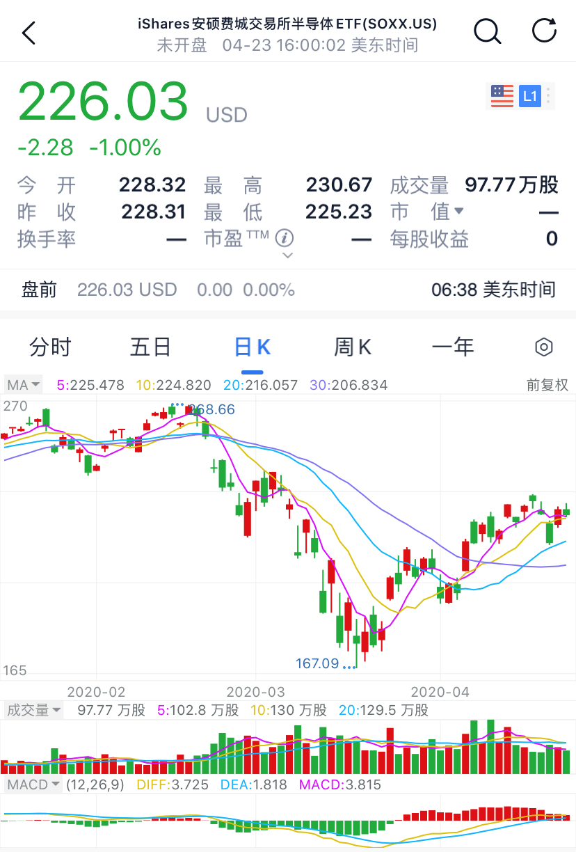 腾讯自选股数据显示,4月23日美股半导体指数ETF(SOXX.US)收盘价格为226.03美元,跌幅为1.00%,总成交量达97.77万股。