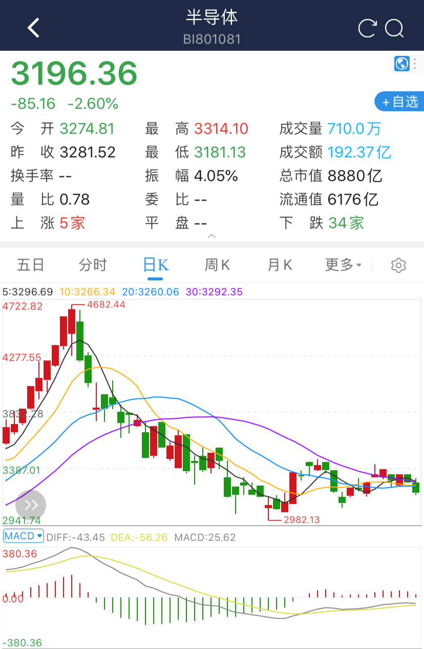海通半导体(BI801081)指数今日(4月24日)收盘指数为3196.36,跌幅为2.60%,总成交额达192.37亿。其中上涨5家,下跌34家。