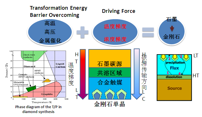HPHT法是人工模拟天然钻石生长条件,在6.7GPa和1500度高温下辅以催化剂等实现石墨相到金刚石相的转变,控温控压和形成温度梯度是合成的关键。