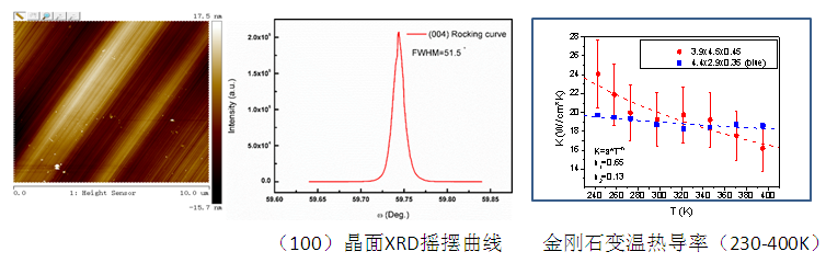 联合俄罗斯国家科学院基础物理所对制备金刚石进行变温热导率测试,结果表明样品室温热导率可达1870-1913W/m·K,完全可以替代现在的常规半导体领域使用的导热材料,并有进一步提升空间。