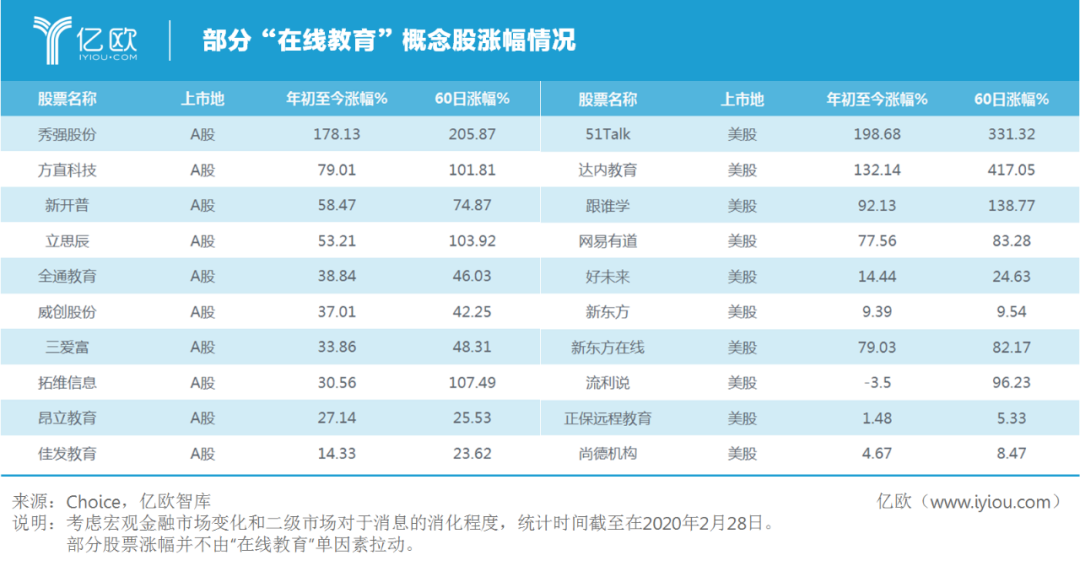 学生、教师、机构全面上线带动了“在线教育”相关概念普及,同时风闻而动的资本市场热炒该概念,进一步助推热度升华。相关概念股无论是否有实际业务增长,股价均有不同程度的上扬。从众心理,舆论概念加剧“在线教育”心智占领。