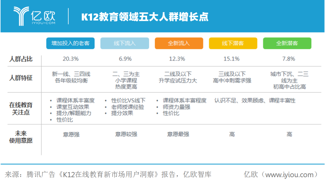 在此以最具代表性的K12市场为例讨论用户对于在线教育的接受程度。根据腾讯广告的统计,截至2020年2月,K12辅导市场用户渗透情况如下,五大人群均爆发出新的增长机会。但亿欧智库认为,老客和全新流入客户更具有可持续性。