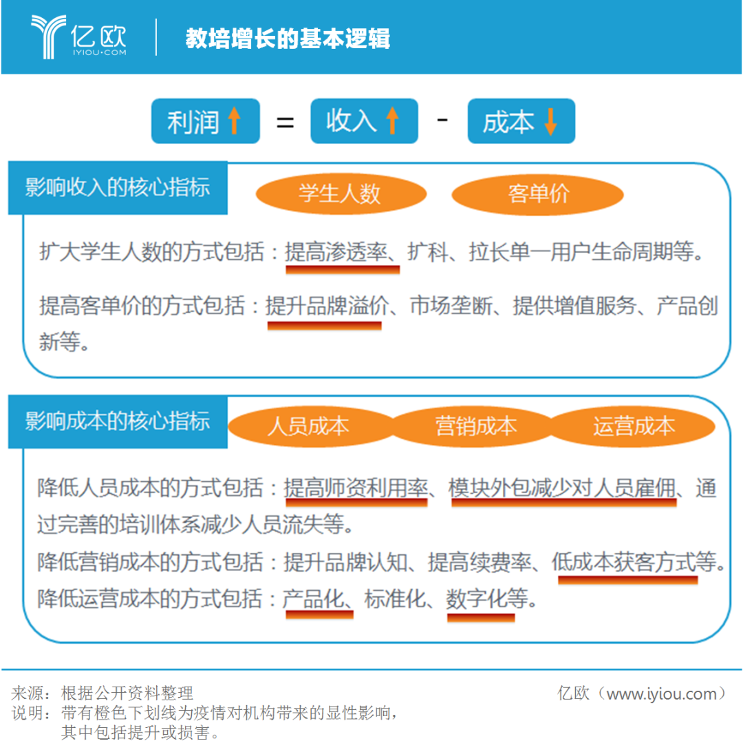 培训增长的底层驱动力源于提高收入和降低成本,其基础模型相对简单,影响的核心因素涉及教学产品、运营管理、营销策略、人力资源等多个方面。