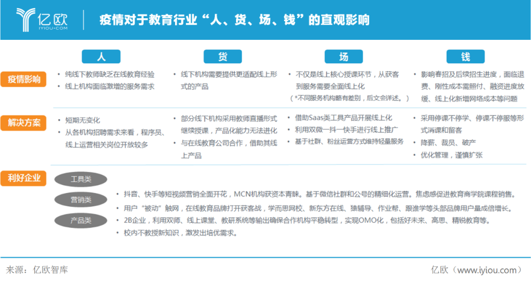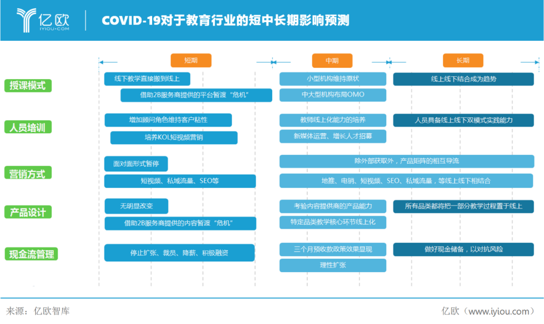 亿欧智库认为,新冠肺炎疫情将助推重塑整个教育行业,对产品、服务、营销、师训等各方面都将带来显著的改变。